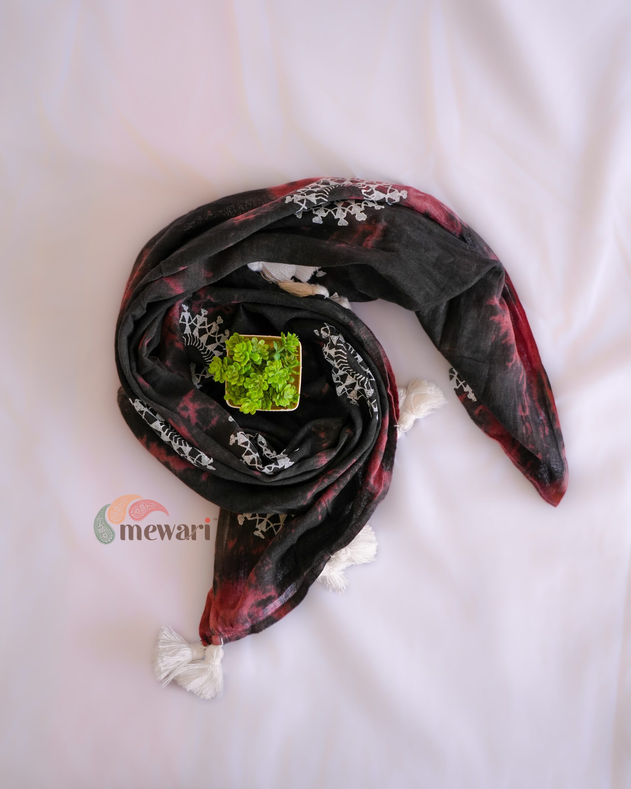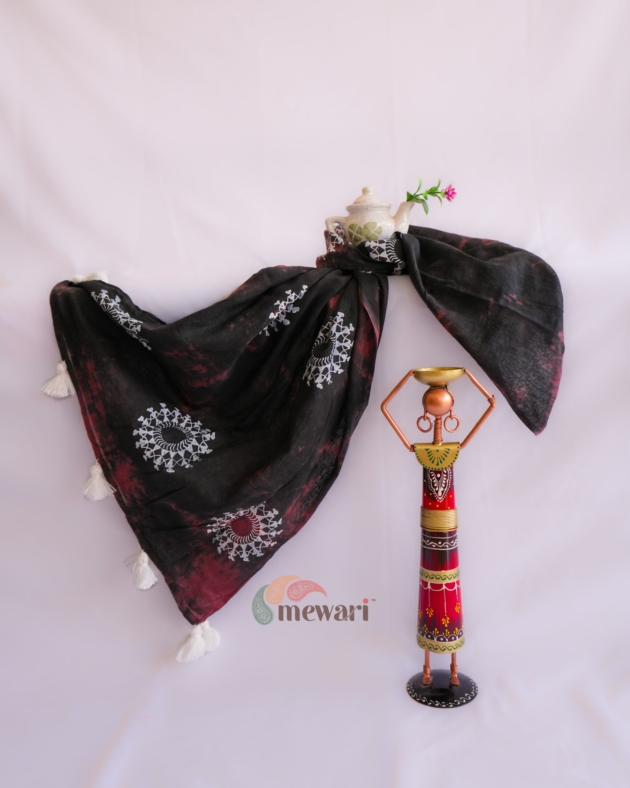 Elevate your style with the Moksha Stole in a warm coffee hue, decorated with intricate black Warli motifs and finished with elegant tassels. Perfectly blending traditional artistry with a contemporary touch, this stole adds sophistication to festive gatherings, casual outings, or plain outfits.