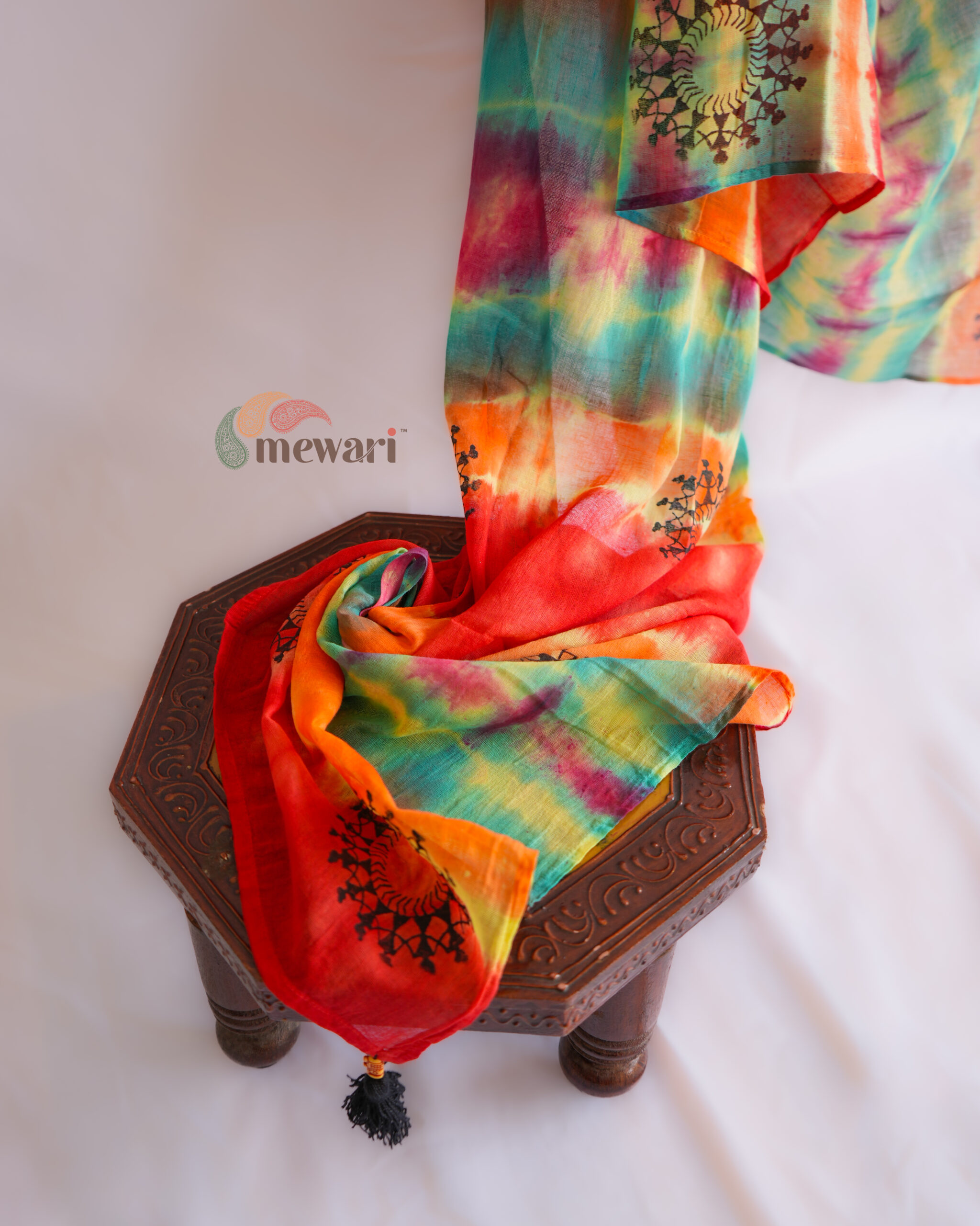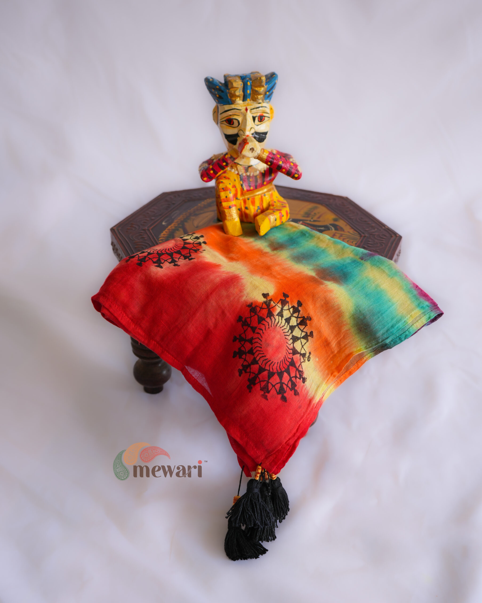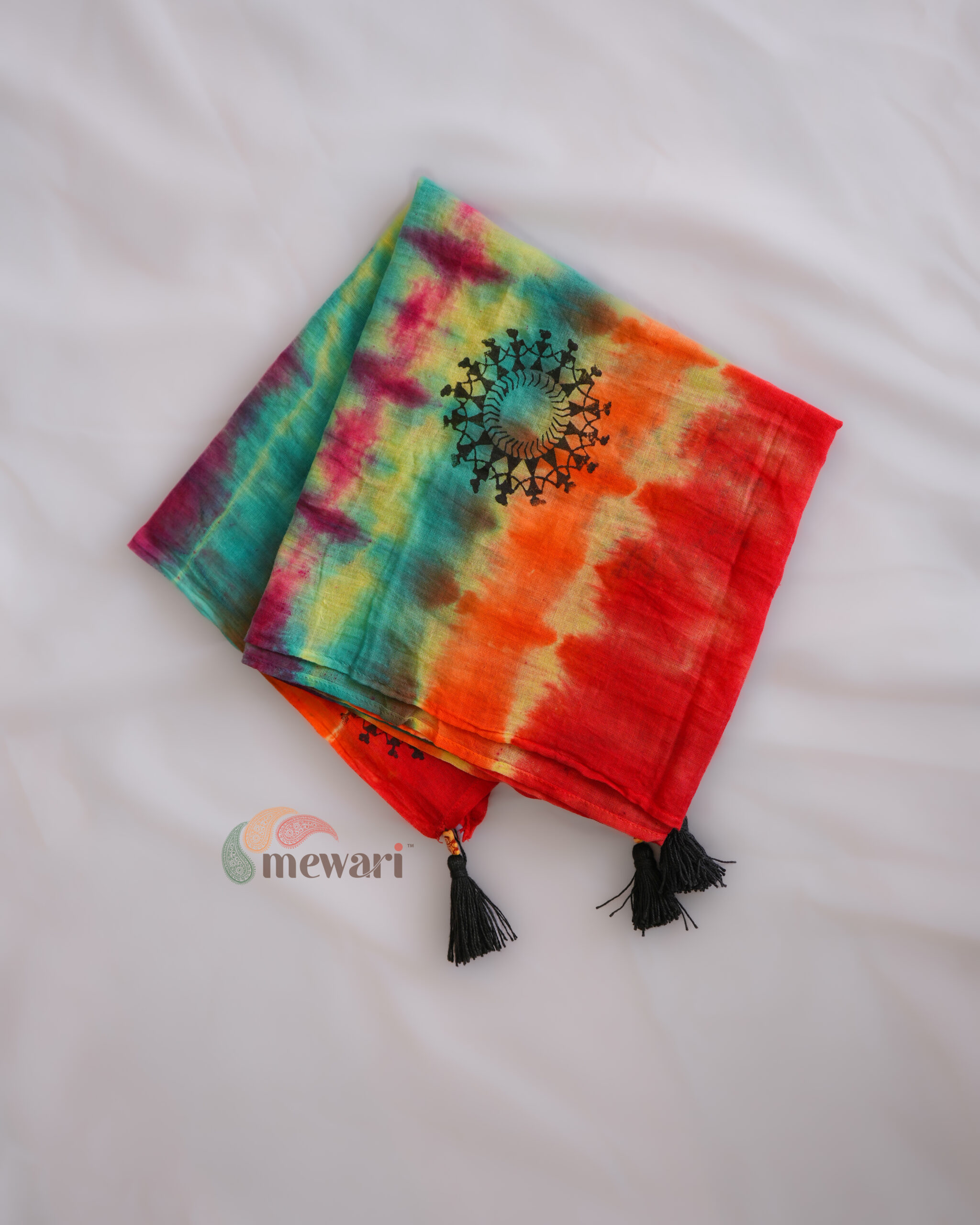 Add a burst of colors to your style with the Rangmala Stole, featuring a vibrant blend of red, orange, green, and blue shades in a tie-dye effect. Accentuated with traditional black Warli motifs and tassel finishing, this stole beautifully balances ethnicity with a trendy, youthful appeal.